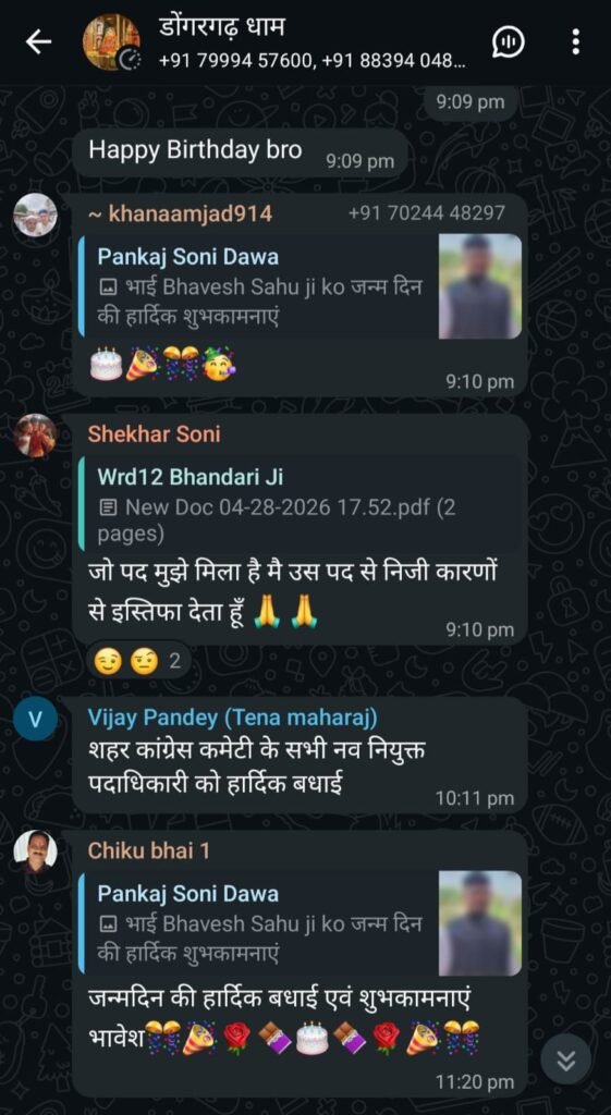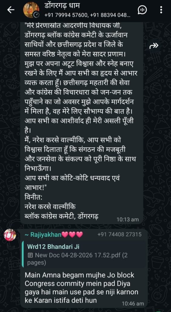 डोंगरगढ़। देश से लेकर छत्तीसगढ़ तक कांग्रेस में अंतर्कलह की खबरें आम हो चुकी हैं, लेकिन इस बार मामला डोंगरगढ़ का है, जहां संगठन में नियुक्तियों के बाद इस्तीफों की झड़ी लग गई। शहर ब्लॉक कांग्रेस कमेटी द्वारा हाल ही में जारी की गई पदाधिकारियों की सूची अब पार्टी के लिए नई मुसीबत बनती दिख रही है।