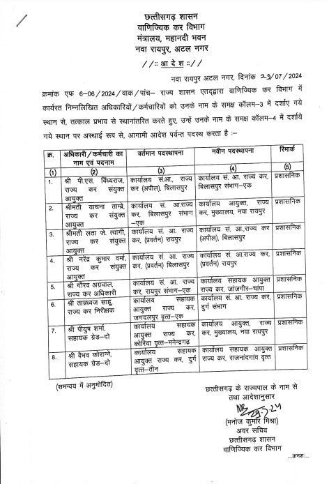 जारी आदेश के अनुसार इसमें पीएस विध्यराज, राज्य कर आयुक्त (अपील) बिलासपुर को संभाग एक कार्यालय बिलासपुर में ट्रांसफर किया गया है।