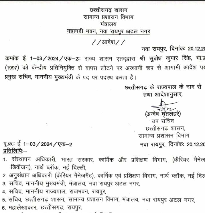 राज्य शासन ने एक महत्वपूर्ण प्रशासनिक फेरबदल करते हुए IAS सुबोध कुमार सिंह को मुख्य मंत्री सचिवालय में प्रमुख सचिव के पद पर नियुक्त किया है।