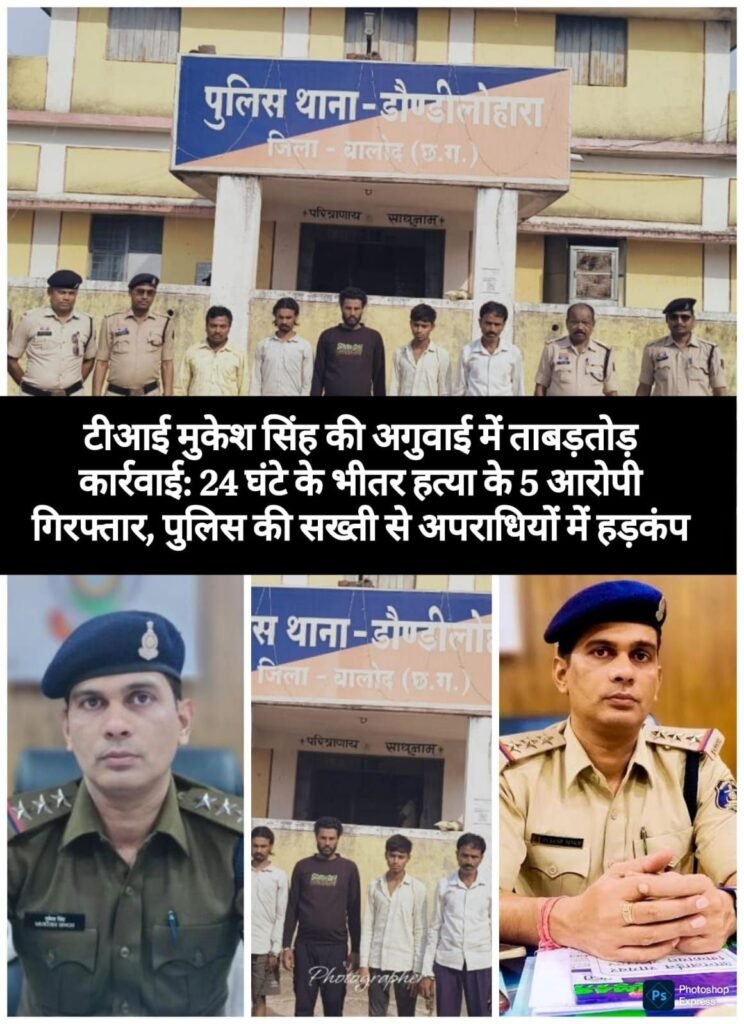 ,,,डौण्डीलोहारा क्षेत्र के ग्राम जोगीभाट में हुई हत्या की सनसनीखेज घटना में पुलिस ने तेज, सटीक और प्रभावी कार्रवाई करते हुए महज 24 घंटे के भीतर सभी 5 आरोपियों को गिरफ्तार कर जेल भेज दिया। थाना प्रभारी मुकेश सिंह के नेतृत्व में हुई इस कार्रवाई ने एक बार फिर यह साबित कर दिया कि डौण्डीलोहारा पुलिस अपराधियों के खिलाफ जीरो टॉलरेंस की नीति पर काम कर रही है।