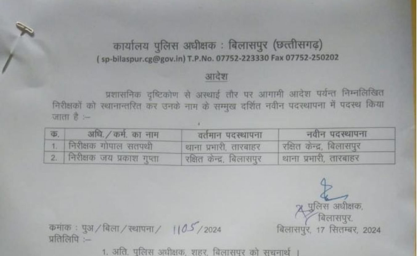 ( जे के मिश्रा ) बिलासपुर के तारबाहर थाना के टीआई गोपाल सत्पत्ति को एसपी ने लाइन अटैच कर दिया है, वहीं पूर्व में सरकंडा थाने के प्रभारी रह चुके जेपी गुप्ता को अब तारबाहर थाने की कमान सौंपी गई है। बताया जा रहा है कि जेपी गुप्ता के नेतृत्व में उनके पिछले कार्यकाल के दौरान क्षेत्र में अपराध पर काफी हद तक काबू पाया गया था। इसी अनुभव और उनके कार्यक्षमता को देखते हुए जिले के एसपी ने एक बार फिर उन्हें यह महत्वपूर्ण जिम्मेदारी सौंपी है।