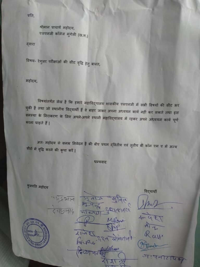 मुंगेली-आज सीट वृद्धि हेतु युवा नेता धर्मेंद्र चतुर्वेदी के नेतृत्व में शासकीय एसएनजी कॉलेज मुंगेली के प्राचार्य को ज्ञापन सौंपा गया,मुंगेली के अग्रणी महाविद्यालय शासकीय एसएनजी में सभी विषयों की सीटें भर चुकी है ।
