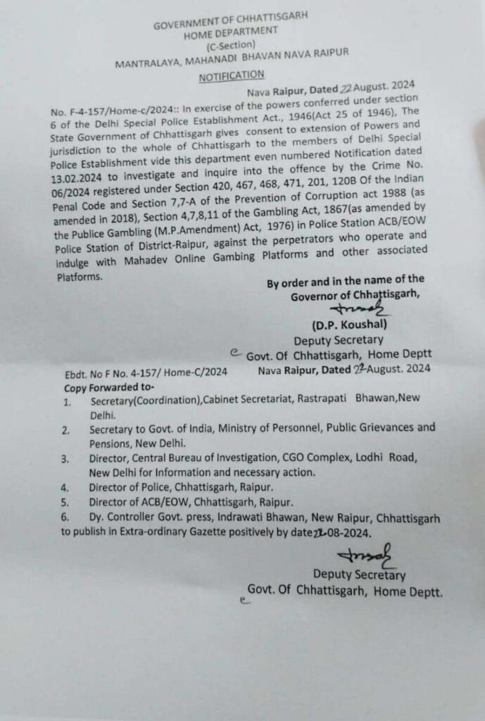 छत्तीसगढ़ में चल रहे महादेव सट्टा ऐप घोटाले की जांच अब CBI के हाथों में है। इस घोटाले के तहत राज्य के विभिन्न थानों में दर्ज 70 केसों को सीबीआई द्वारा जांचा जाएगा।