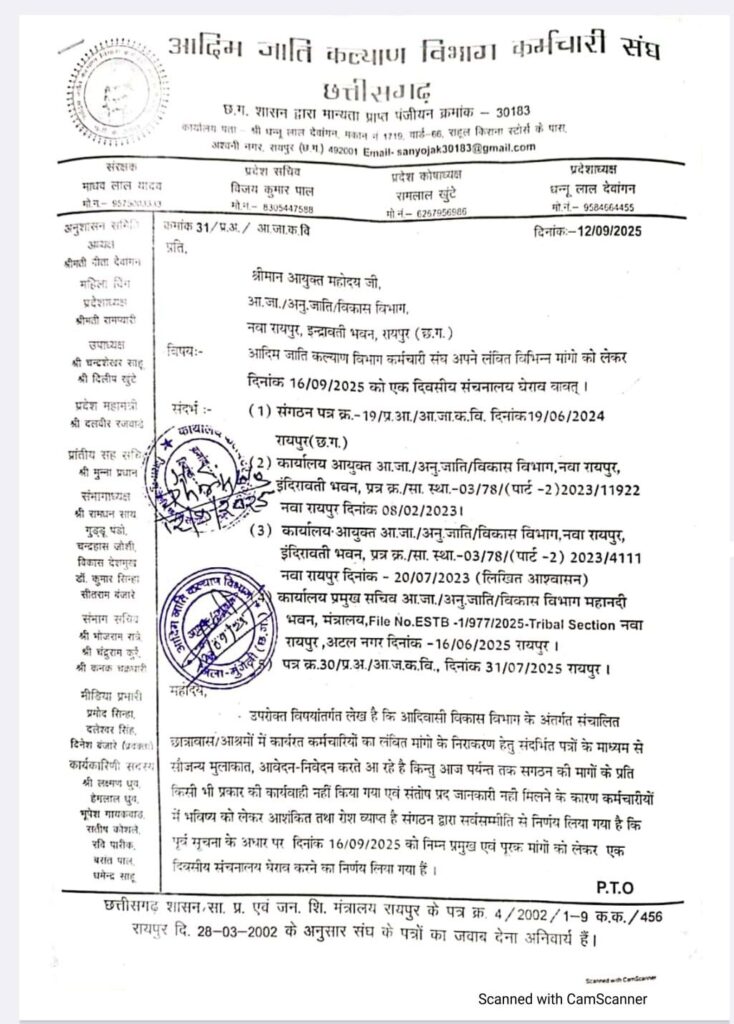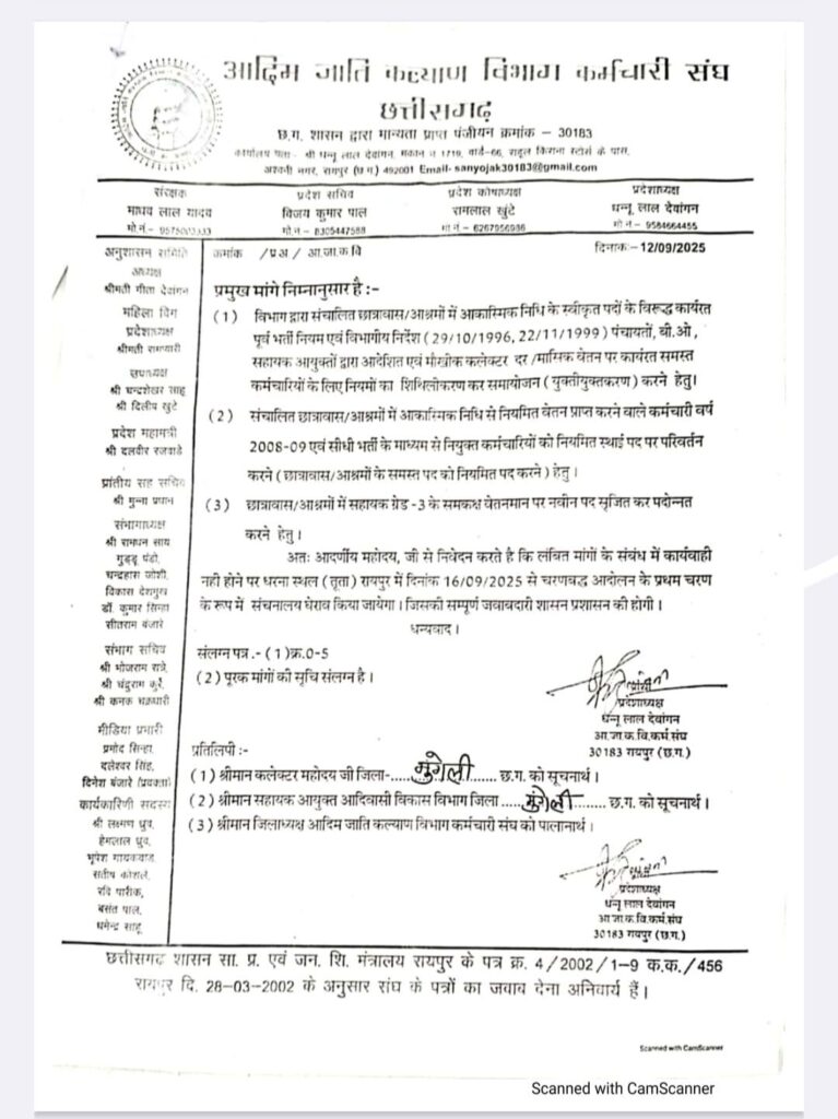 मुंगेली- अपने तीन सूत्री मांगे को लेकर आदिम जाति कल्याण विभाग कर्मचारी संघ 16 सितंबर को प्रदेश स्तर पर नया रायपुर के तूता धरना स्थल पर एक दिवसीय प्रदर्शन की तैयारी में है।प्रदेश भर के कर्मचारी संचनालय का घेराव करेंगे।संघ का कहना है कि इस प्रदर्शन के बाद भी कर्मचारी संघ की मांग पूरी नहीं होती है तो आने वाले दिनों में अनिश्चितकालीन हड़ताल करने के लिए बाध्य होंगे।