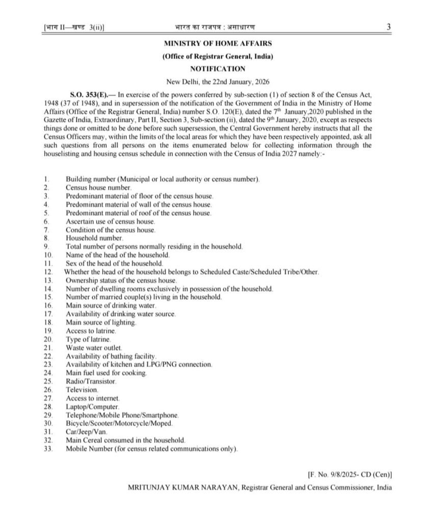 भारत सरकार ने अगले साल 2027 में होने वाली जनगणना के लिए प्रथम चरण के प्रश्नावली की अधिसूचना जारी कर दी है। द्वितीय चरण अर्थात जनसंख्या गणना की प्रश्नावली यथासमय अधिसूचित की जाएगी।