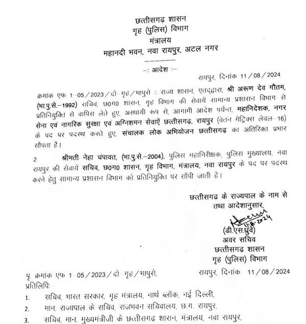 छत्तीसगढ़ में 2 IPS अधिकारियों के प्रभार में बदलाव किया गया है। 1992 बैच के IPS अरूण देव गौतम की पुलिस विभाग में वापसी हो गई है।