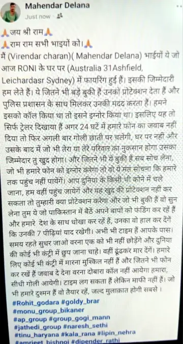 महेंद्र डेलाणा ने अपनी पोस्ट में लिखा ‘मैं (Virendar charan) (Mahendar Delana) भाईयों ये जो आज RONI के घर पर (Australia 31 Ashfield, Leichardasr Sydney) में फायरिंग हुई हैं. इसकी जिम्मेदारी हम लेते हैं’. उसने लिखा कि ये जितने भी बड़े बुकी हैं उनको प्रोटेक्शन देता हैं और पुलिस प्रशासन के साथ मिलकर उनकी मदद करता हैं. डेलाणा ने कहा कि हमने इसको कॉल किया था तो इसने इग्नोर किया था.