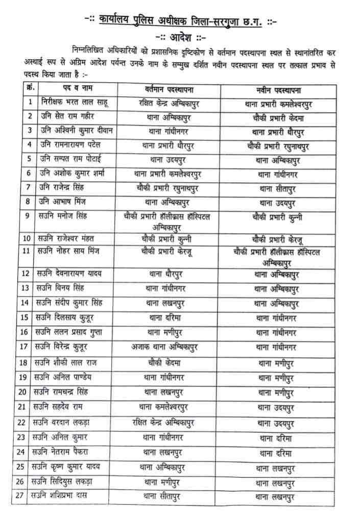 छत्तीसगढ़ के सरगुजा जिले में पुलिस विभाग में बड़ा फेरबदल किया गया है। कानून व्यवस्था को और सुदृढ़ करने के उद्देश्य से जिले के एसपी ने कई पुलिसकर्मियों के तबादले का आदेश जारी किया है।