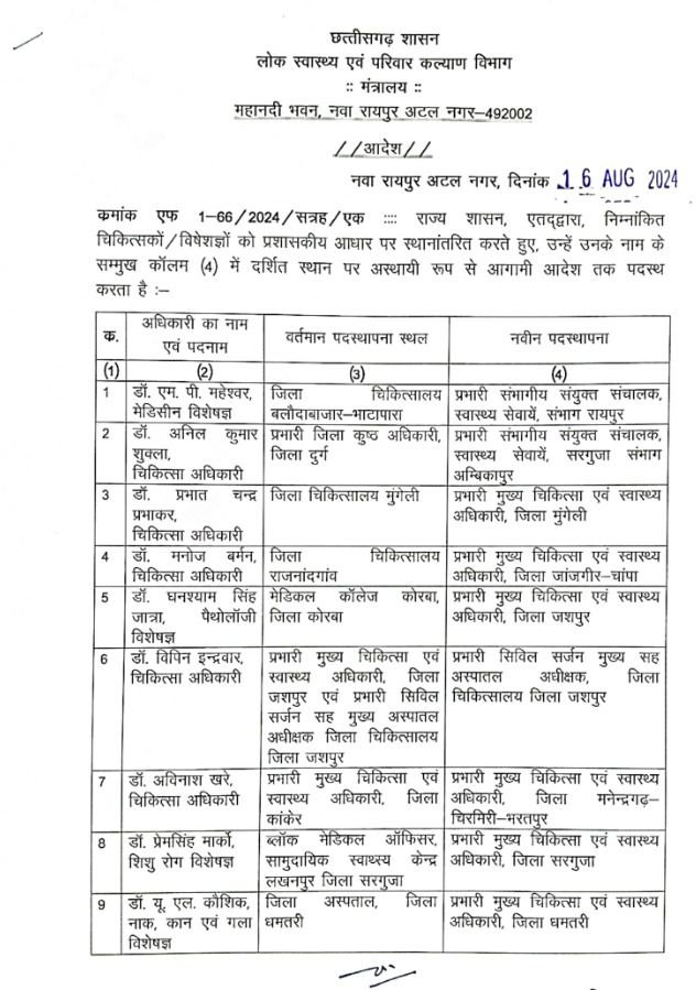 जशपुर, सरगुजा, धमतरी, सक्ती, सुकमा, दंतेवाड़ा सहित कई जिलों में सीएमएचओ, सिविल सर्जन व चिकित्सा अधिकारियों के तबादले किये हैं।