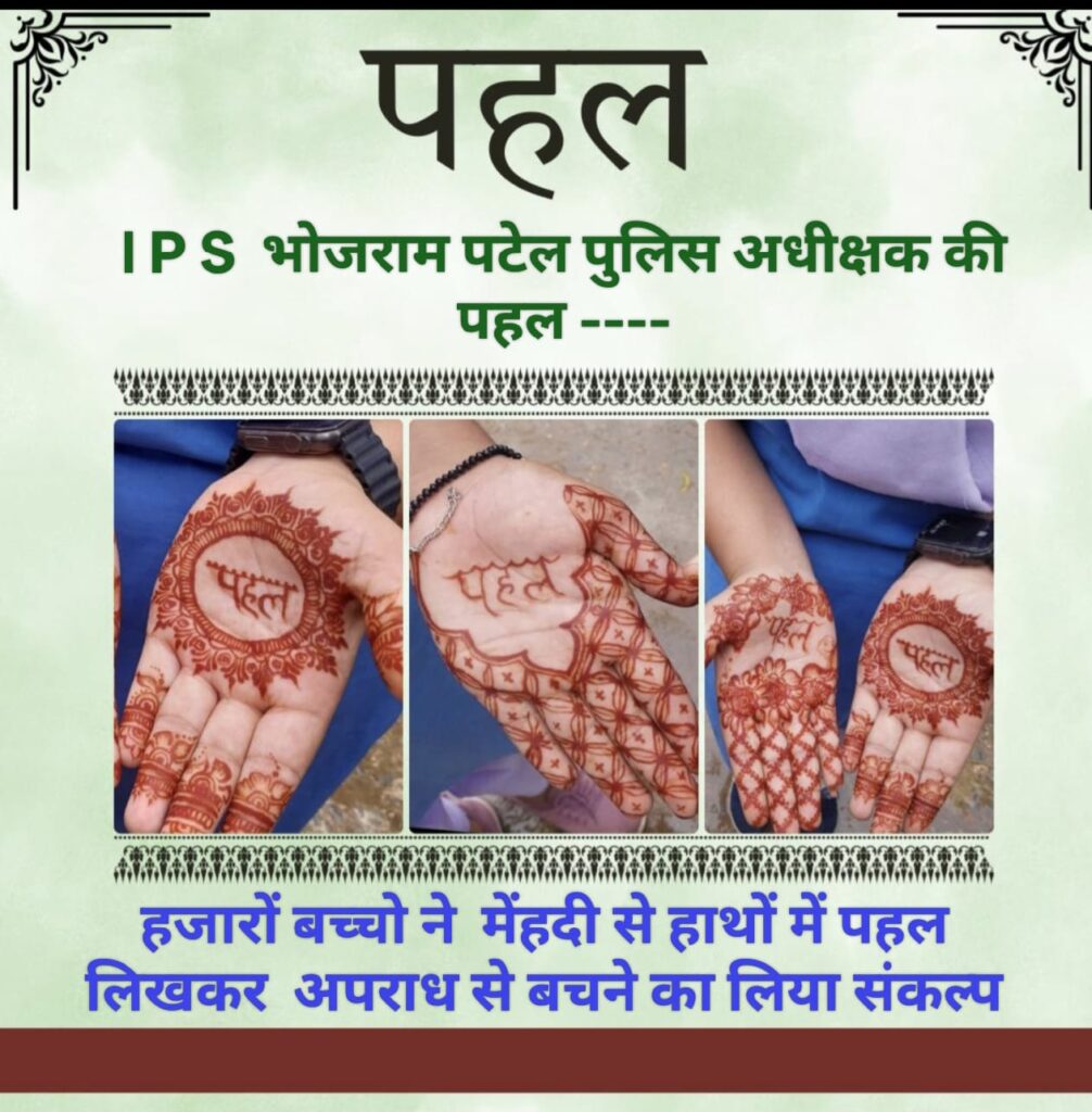 कार्यक्रम के दौरान बच्चों ने अपनी हथेलियों पर ‘पहल’ शब्द वाली मेहंदी लगाई, जो इस “पहल” का प्रतीक है। आईपीएस भोजराम पटेल द्वारा शुरू की गई यह मुहिम स्थानीय स्कूलों और समुदायों में आयोजित की गई, जहां बच्चों को अपराध न करने और समाज के लिए उपयोगी बनने की शपथ दिलाई गई।हजारों बच्चों की भागीदारी ने इस कार्यक्रम को सफल बनाया, जो अपराध रोकथाम के लिए सांस्कृतिक तत्वों का उपयोग करता है।