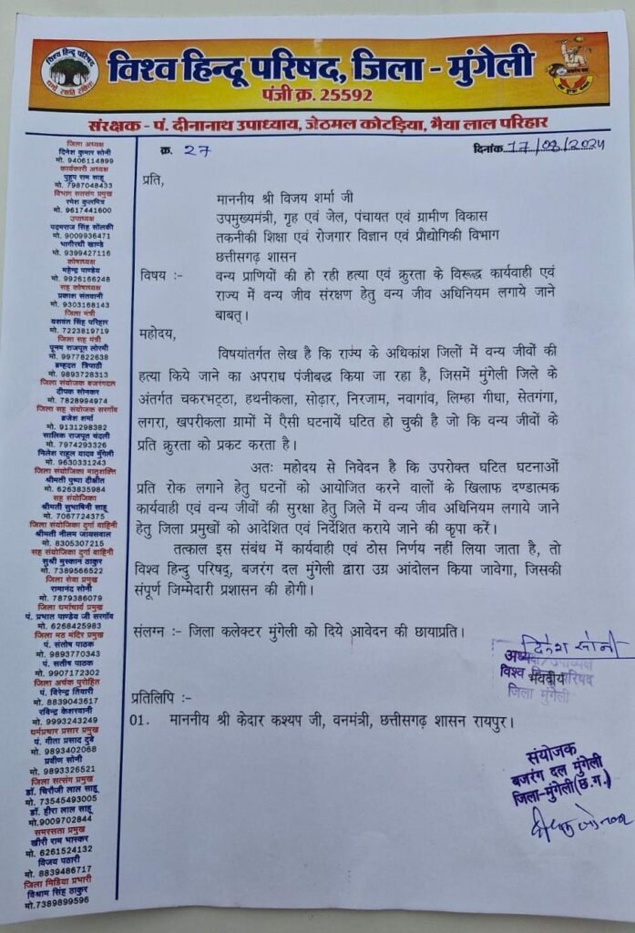 अतः ऐसी घटनाओं पे त्वरित रोक लगाई जाए और इन घटनाओं को आयोजित करने वालों पे दंडात्मक कार्यवाही की जाए साथ ही वन्य जीवों के सुरक्षा दृष्टि के मद्देनजर जिलों में वन्य जीव अधिनियम लागू किये जाने आदेशित व निर्देशित किया जाए।इस अवसर जिला अध्यक्ष दिनेश कुमार सोनी, जिला सयोंजक दीपक सोनकर के साथ विहिप बजरंग दल के जिला पदाधिकारी मुंगेली मौजूद रहे ।