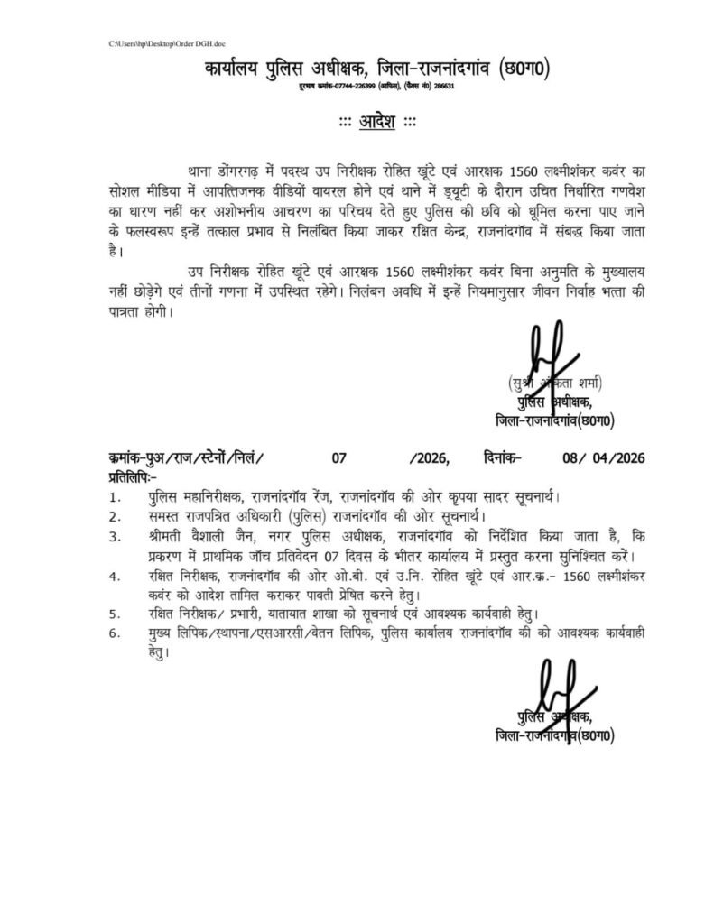 दोनों पर अशोभनीय आचरण और पुलिस विभाग की छवि धूमिल करने का आरोप लगाया गया है। एसपी द्वारा जारी आदेश में स्पष्ट किया गया है कि विभाग में इस तरह के कृत्य किसी भी स्थिति में बर्दाश्त नहीं किए जाएंगे।