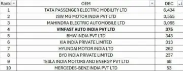 इसी महीने VinFast ने कुल 375 इलेक्ट्रिक गाड़ियां रजिस्टर कराईं. तुलना करें तो Hyundai ने 262और Kia ने 313 यूनिट्स की बिक्री की. इन आंकड़ों के दम पर VinFast चौथे स्थान पर पहुंच गई. BMW 300 यूनिट्स के साथ टॉप-5 में शामिल रही, लेकिन VinFast का प्रदर्शन नए ब्रांड के हिसाब से काफी प्रभावशाली माना जा रहा है.