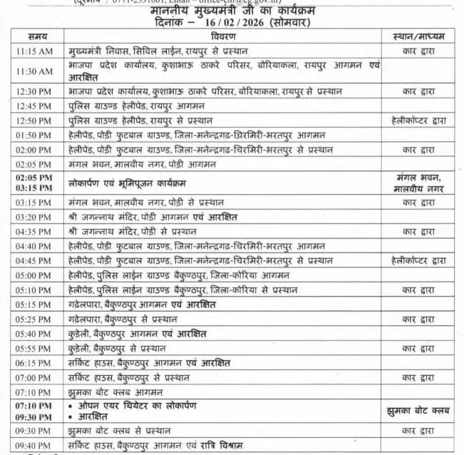 निर्धारित कार्यक्रम के अनुसार, मुख्यमंत्री सुबह 11:30 बजे भाजपा प्रदेश कार्यालय कुशाभाऊ ठाकरे परिसर में आयोजित बैठक में हिस्सा लेंगे। इसके बाद दोपहर 12:50 बजे पुलिस ग्राउंड हेलीपैड से मनेंद्रगढ़-चिरमिरी-भरतपुर के लिए रवाना होंगे।