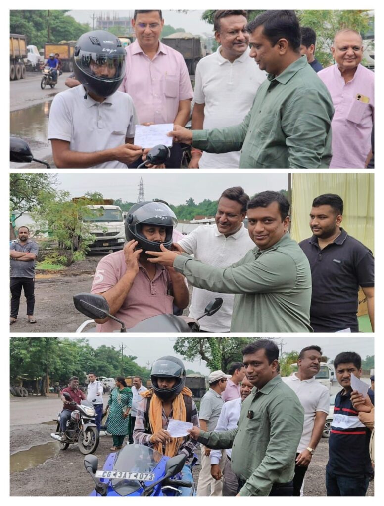 आज, रायगढ़-पूंजीपथरा मार्ग के उर्दना पुलिस लाइन के समीप, एसपी दिव्यांग पटेल ने यातायात पुलिस और समाजसेवियों के साथ मिलकर नियम तोड़ने वाले वाहन चालकों को निशुल्क हेलमेट का वितरण किया। एसपी पटेल ने इस अवसर पर नागरिकों से अपील की कि वे स्वयं की सुरक्षा और परिवार की जिम्मेदारी को ध्यान में रखते हुए वाहन चलाते समय हमेशा हेलमेट पहनें।